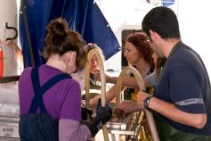 Cuando el arte llega a bordo, la muestra recogida sufre un largo proceso, durante el cual se separan a mano las especies de mayor tamaño, se tamiza el sedimento obtenido a través de diferentes mallas, se identifican, anotan y fotografían las especies, se cuentan y pesan los ejemplares de cada una, se etiquetan, se anestesian (en su caso) y, finalmente se fijan en alcohol o formol, y se guardan para estudios posteriores en tierra. Aunque las muestras de los días 2 y 3 no son especialmente ricas, hay trabajo para todos, especialmente para Pilar y Carmen, que no dan abasto y son las que habitualmente “cierran y apagan la luz” del laboratorio húmedo.