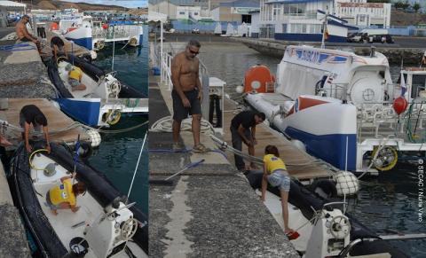 Aunque la previsión no es la mejor, salimos otra vez el día 18 con la esperanza de poder trabajar con esfuerzo visual al menos hasta el mediodía. Como sorpresa desagradable, a media milla de la bocana el equipo es alertado por un fuerte olor a quemado. Uno de los motores del barco no se refrigera y varias mangueras y cables se han prendido fuego. Con un solo motor volvemos a puerto y atracamos en Morro Jable a las 10.10 h. Hoy domingo será difícil gestionar esta reparación, aunque conseguimos encontrar un mecánico que vendrá mañana lunes a primera hora.