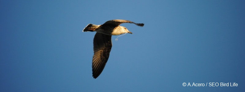 Gaviota patiamarilla (Larus Michahellis). Ejemplar juvenil con restos de arte de pesca en su pico. A.Acero ©SEO/BirdLife