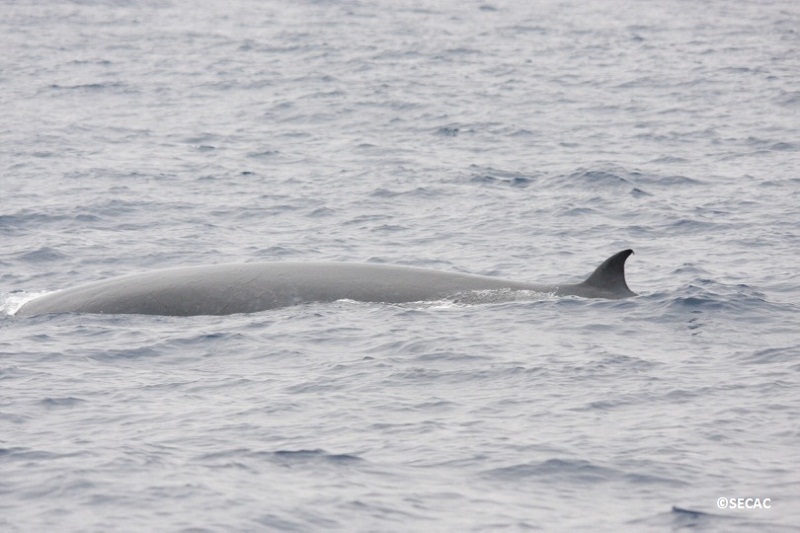 El otro protagonista de la jornada fue un rorcual tropical (Balaenoptera brydey), muy esquivo, realizaba respiraciones cortas e inmersiones largas. Pudo ser identificado por insistencia. Al final lo abandonamos para acudir al grupo de delfines. Probablemente, se estaba alimentando en el área al igual que los grupos de delfines detectados. No obstante no mantenía un rumbo fijo de desplazamiento sino que aparecía constantemente omnidireccionalmente.