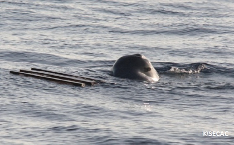 Se avistan zifios de Blainville (Mesoplodon densirostris) durante la parada de la primera escucha acústica. Aparecen un macho y dos hembras a escasos metros del barco, rodeándolo pausada y tranquilamente, permitiendo la obtención de unas excelentes fotos para su estudio morfológico e identificación. Tras casi 50 minutos en su compañía deciden finalmente sumergirse, momento en el cual abandonamos el avistamiento y continuamos con el esfuerzo de campaña.
