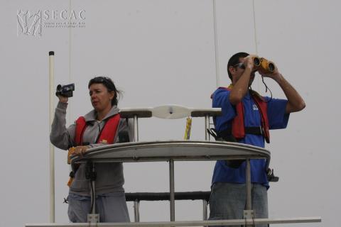 A las 8:30 h ya está el equipo con la manguera y la aspiradora en ristre. La verdad es que en una embarcación siempre hay algo que hacer, sobre todo en materia de limpieza y mantenimiento, así que mientras unos se afanan con cristales, pasamanos y demás, otros preparan todo el material de investigación a utilizar durante la jornada.