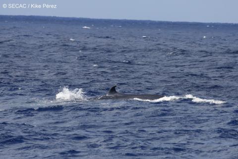 A lo largo de la mañana no vemos nada… hasta las 13.25 h momento en el que se observan unos soplos a unos 3500 m de la embarcación. Nos acercamos a la zona y comprobamos que se trata de un rorcual tropical (Balaenoptera edeni). Se fotoidentifica su aleta dorsal, complicada tarea porque se muestra muy evasivo y además el mar se ha revuelto muchísimo. Tras finalizar el avistamiento ponemos rumbo al puerto con un temporal a nuestra popa bastante fuerte.
