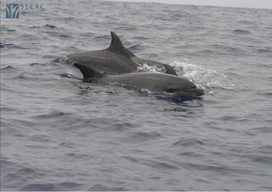 Donde sí se anotaron todos los grupos de edad, neonatos inclusive, fue durante el contacto con varios grupos de delfines moteados (Stenella frontalis), que, como siempre, se sintieron atraídos hacia el barco, sobre todo a la ola que desplaza la proa y al cable del hidrófono, donde estuvieron emitiendo silbidos y clicks durante gran parte del avistamiento. A destacar en esta primera semana también fueron dos avistamientos de zifios de Cuvier (Ziphius cavirostris) y uno de cachalote enano (Kogia sima). En el caso de los zifios, hubo un avistamiento de 4 individuos, mínimo dos machos maduros, que llamó la atención de los investigadores por lo inusual de ver a los zifios inmóviles en superficie ¿descansando quizá? Después de inmersiones relativamente cortas (no más de 15 minutos). Se realizaron diez esperas y después de todas ellas los individuos fueron reavistados y fotografiados. El cachalote enano sin embargo, apenas si pudo ser fotoidentificado desde lejos ya que nada más detectar la presencia de la embarcación se hundió y no volvió a ser visto.