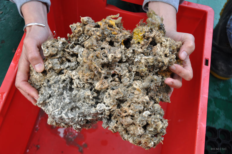 Durante la inmersión pudimos comprobar que estos promontorios se asemejan a los arrecifes de poliquetos serpúlidos que normalmente crecen en la línea de costa. Se podría decir que son arrecifes subfósiles (en proceso de fosilización) ya que la estructura calcárea está formada por tubos de poliquetos muertos y sus orificios y espacios rellenados por sedimento y otros restos orgánicos. Arrecifes costeros como estos recuerdan a los que podemos ver de algas calcáreas en la misma zona o también de poliquetos que conforman tubos calcáreos en zonas como en el litoral de Castellón. En las imágenes se puede ver la muestra que recogimos de este arrecife para ser estudiada en nuestro laboratorio.