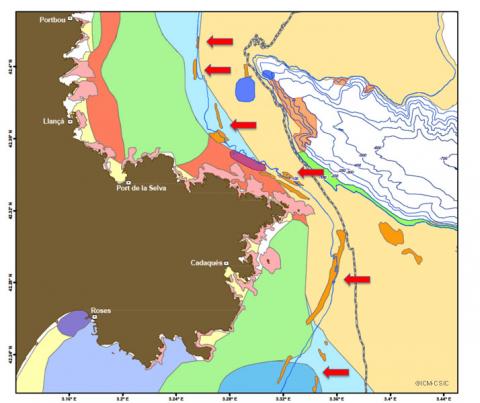 Como se aprecian en la imagen, este límite (flechas rojas) lo marcan unas barras rocosas de naturaleza biogénica, esto es, formadas por esqueletos y actividad de los organismos. Las zonas más al sur o al norte del Cap de Creus se han erosionado o cubierto por las arenas de las playas. Estas barras son además, ejemplos de comunidades coralígenas de profundidad con una rica fauna de gorgonias, poliquetos, esponjas, etc.
