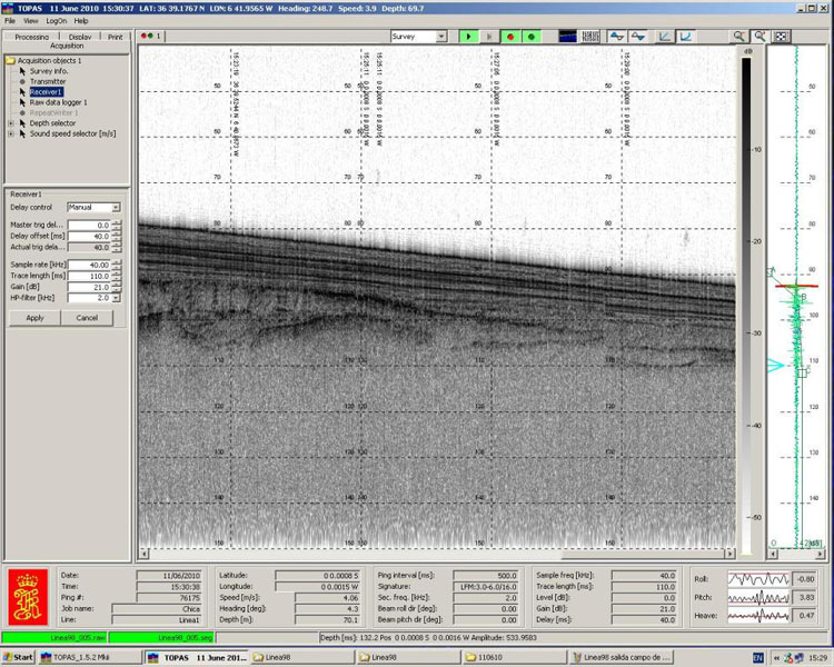 Desde muy temprano, a las 10:35 horas, comenzamos a tener algunos problemillas con la sonda multihaz. El software se bloquea y dejamos de registrar. Nuevos problemas con el sensor de movimiento inercial (IMU). El técnico Antonio Torres hace todo lo que puede por reparar la avería, pero todos los esfuerzos resultan baldíos. Discutimos la forma de proseguir sin que tengamos que regresar a tierra y así aprovechar el día, y decidimos, como alternativa más plausible, completar el estudio del campo de gas realizando perfiles de TOPAS perpendiculares a la costa, mientras se analiza con calma el problema técnico y se contacta con los ingenieros de SIMRAD para ver que solución nos ofrecen. El resultado sobre el registro es que se forman ondulaciones que se hacen más patentes en los barridos a menos profundidad, mientras que a más agua el error es menos visible. Es evidente que el efecto del oleaje se está dejando sentir en la sonda. Como casi siempre, los problemas se presentan cuando se va a iniciar el fin de semana. Vaya por Dios. Los técnicos nos anuncian su próxima visita para el lunes por la tarde, con lo que tendremos que dedicar la mañana del martes a probar el equipo después de que haya sido reparado. Esto nos causa un grave trastorno en la consecución de los objetivos científicos. Veremos a lo largo de la próxima semana como se comporta el sistema para reconducir la investigación en la forma que resulte más eficiente.