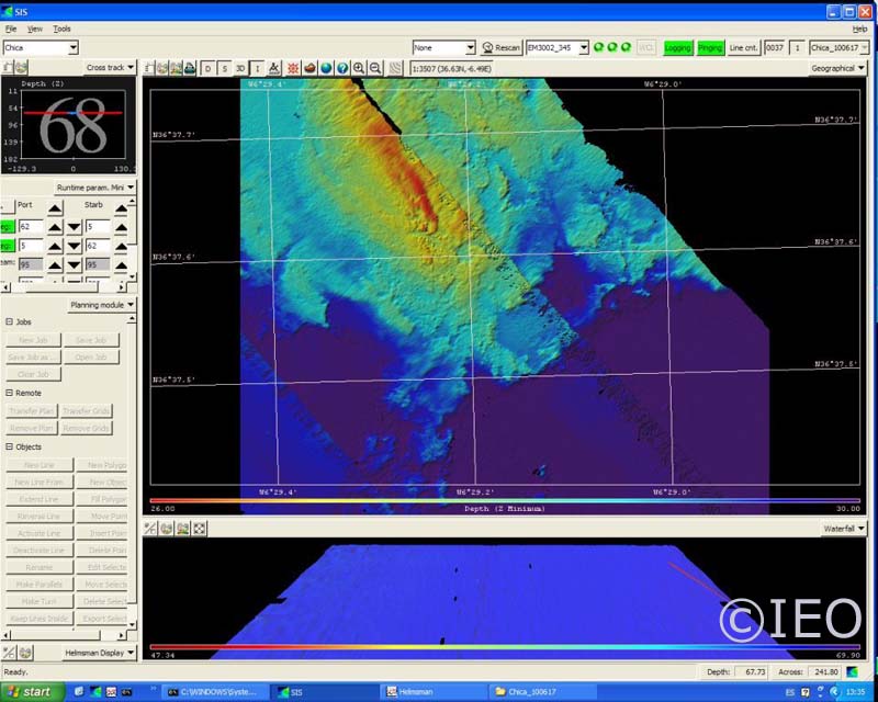 Observad esta captura de pantalla que os pongo a la izquierda (fragmento de un mosaico), tomada de una de las zonas próximas a Rota, donde afloran las ya conocidas por todos nuestros seguidores, rocas ostioneras. En colores rojizos sobresalen las crestas del afloramiento mientras que en tonos azulones quedan representados los fondos aplacerados sedimentarios. Podréis apreciar unas bandas que atraviesan la pantalla oblicuamente, de abajo a arriba. Estas bandas son los solapes entre un barrido y el realizado a continuación del anterior en sentido opuesto. Estos solapes, junto con los filamentos ennegrecidos (que representan momentos en los que el buque se ha alejado de la línea y no hay datos), se resuelven en el procesado digital que realizamos una vez que hemos finalizado la prospección. Así, podréis imaginar que una campaña oceanográfica genera una actividad posterior, que consume bastante tiempo, que no nos permite disponer de la información inmediatamente para su explotación científica. En consecuencia, no podremos analizar los datos hasta que no estén convenientemente depurados.
