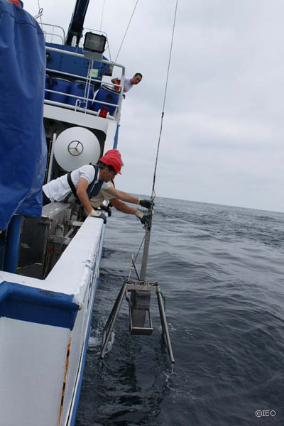 Yo vuelvo a decirle al Dr. Rueda que le echo una mano en el tamizado, pues veo que el hombre es feliz con su fauna bentónica y necesita que le quiten muestras de en medio. Allá me voy. Me sorprende ver como de cada cajetín del box corer, los científicos sacan varios tarritos. Cada uno para cada cosa. Esto para la geoquímica, dice Nieves López. Esto para la materia orgánica, dice Jóse Rueda. Ahora la temperatura en el sedimento, luego el potencial redox, y así, un sin fin de mediciones en cada una de las muestras que sustraen al fondo marino. Luego, a lavar y separar fauna. Tremendo, verdaderamente tremendo. Acaba uno agotado. De sol a sol. Reconozco que este trabajo tiene mérito. Menos mal que solamente estoy a bordo para hacer la crónica diaria, digo para mis adentros.