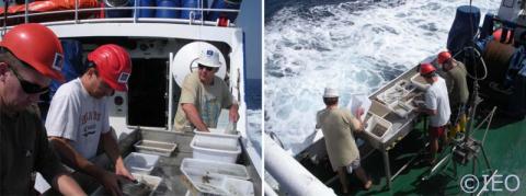 Jóse Rueda, Melo González y Víctor Díaz-del-Río dedicados al tamizado de las muestras sobre la mesa de cubierta ©IEO