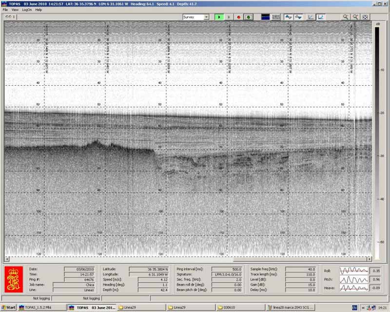 Captura de pantalla de la sonda paramétrica, en la que se observa el nivel basal fuertemente erosionado, sobre el que se desarrolla un depósito en cuña, con la pendiente hacia la derecha ©IEO