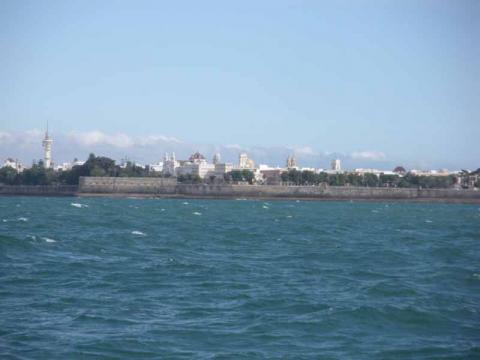 Navegamos a toda máquina hacia el punto de inicio de los perfiles, analizando los datos que hemos recogido hasta hoy, para así ir fijando los puntos de muestreo biológico y sedimentario. Dejamos a babor la arboleda de la Alameda Apodaca y el amurallado Castillo de la Candelaria, construido en la época de Carlos III, y nos dejamos mecer por el viento de poniente que ya se deja notar. Llegados al punto de inicio de los perfiles, 36º 34.71´N/6º 35.82´W, y a una profundidad de 63.2 metros, volvemos a bautizar el Perfilador de Velocidad: Tª en superficie, 21.15º C; Tª en profundidad, 15.1º C. Esto quiere decir que tendremos que aplicar la corrección de propagación de la velocidad de sonido a 1509.6 m/s en superficie y 1526.56 m/s en profundidad. Ahí vamos. Nos disponemos a correr la primera línea.