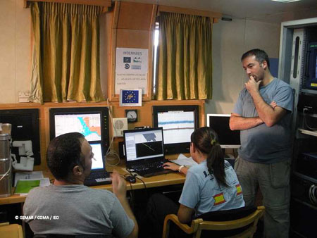 Cabe destacar un hecho sin precedentes que ha marcado la agenda del día. La Teniente de Navío Carmen Marina Goicoechea Margalef que se encuentra destacada a bordo, comisionada por el Instituto Hidrográfico de la Marina, junto con el especialista Hidrógrafo Sargento Francisco Javier Monroy López, ha aceptado la invitación del Capitán para pilotar el barco. La TN Goicoechea está destinada en el B/H Tofiño y es una experimentada navegante e hidrógrafa. No menos hábil es el Sgto. Monroy, también destinado ene. Mismo buque, quien ha dado claras muestras de su buen hacer con la multihaz y su profundo conocimiento del software de procesado. Con profesionales como estos podemos asegurar un futuro muy prometedor para la hidrografía en España. Nosotros estamos muy satisfechos de tenerlos a bordo en esta campaña pues sus constructivas aportaciones nos ayudan a maximizar los resultados de la prospección.