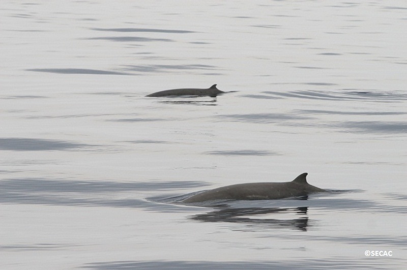 En el primer avistamiento se observa un solo ejemplar de Zifio de Cuvier (Ziphius cavirostris), un macho adulto muy marcado que perdemos tras la primera inmersión. El segundo avistamiento (Ziphius cavirostris) lo realizamos a continuación, pensamos que se trataba del primer ejemplar acompañado de otro. Pronto nos percatamos que eran dos animales diferentes. Uno de ellos presentaba una deformación en el extremo de la mandíbula inferior. Las condiciones del mar nos permiten mantenernos con estos animales más de tres horas ya que en cada emersión, tras la espera, fueron rápidamente detectados.