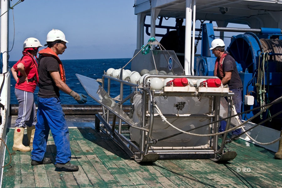 El día 28 de julio comenzamos las tareas de la segunda parte, dirigidas a los muestreos con arrastres de fondo y pelágicos. La estrategia de muestreo consiste en estaciones multidisciplinares, muestreando a la misma profundidad con diversas artes, tanto de fondo como pelágicas, cuidadosamente diseñadas para distintos fines. Además del trineo fotogramétrico “Politolana”(utilizado en la primera parte de la campaña), en el estudio de los fondos se usan las dragas de roca (en sustratos duros); el bou de vara (dirigido a los invertebrados que viven sobre el fondo y pequeños peces); el arte de arrastre conocido como GOC dirigido a las comunidades demersales (cercanas al fondo) y especialmente a los peces; el trineo suprabentónico, especialmente diseñado para muestrear pequeños crustáceos próximos al fondo, que son de gran importancia alimenticia para los depredadores bentónicos y demersales, y, por último, la draga de fango (“mesobox-corer”), utilizada para el estudio del tipo de sedimento (tamaño de grano, contenido en materia orgánica) y de la comunidad endofaunal (la que vive enterrada en el sedimento).