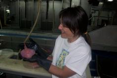 Los dos días siguientes, 30 y 31, se trabaja a menos profundidad (700-800 m), muestreando con el GOC, el bou de vara, el trineo suprabentónico y la red WP2, lo que saca a la luz nuevas maravillas. Con la cámara submarina de video “Trawlcamera” incorporada a la relinga de flotadores pudimos recoger imágenes del GOC muestreando algunas especies como Hoplostethus mediterraneus y el tiburón Scymnodon ringens. El mar, aunque prácticamente en calma estos días, trata con dureza a los sofisticados artes de muestreo. Con cierta frecuencia se averían y hay que proceder a su reparación a bordo. El contramaestre José, con su equipo de marineros, se afana en mantener a punto las redes para cada lance. En esas tareas de zurcido destaca Inma, la investigadora responsable del trineo suprabentónico, que con su permanente sonrisa y sus trenzas parcialmente cubiertas por el casco de seguridad, zurce con hilo rojo y con habilidad las dos mangas de red del trineo; así se la ve a muchas horas, incluidas las nocturnas, mimando a su querido (y costoso) instrumento de muestreo. Pese a todos sus cuidados, el trineo suprabentónico se empeña en traer a bordo “algo” más que crustáceos: corales, holoturias, sedimento, e incluso una posible y bella nueva especie de nudibranquio (gasterópodo sin concha) capturado a más de 1.000 m. que hace felices a los malacólogos a bordo. Las boyas del GOC revientan en una de las inmersiones más profundas debido a la presión (más de 170 atmósferas a 1.700 m), y hay que regresar a Vigo la noche del 31 para sustituirlas.