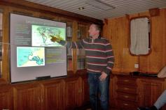 Cae la noche y la actividad en cubierta cesa, de manera que los científicos se disponen a procesar el acumulo de material que ha ido quedando arrinconado por falta de espacio. Esta tarea se prolongará hasta bien avanzada la noche. Hoy la cantidad de material ha sido verdaderamente ingente y se nota la cara de cansados que tienen todos. Tomás dice que unos mojitos van a levantar el ánimo. La cena, evidentemente nos recompone, particularmente la sopita caliente que Antonio Fernández Iglesias, el Primer Cocinero, nos ofrece para atemperar el cuerpo cuando abandonamos la cubierta. A las nueve y media tenemos nuestra tercera conferencia a bordo. Es el turno de Jose Luis Rueda, que nos deleita con una charla amena, divulgativa y muy interesante. En la charla nos habla de la confluencia de hábitats y especies entre el mar Mediterráneo y el mar Atlántico, sobre todo en la zona del Golfo de Gibraltar y del Golfo de Cádiz, y de las características de las comunidades de Cnidarios (corales, anémonas), moluscos y crustáceos. La confluencia en las comunidades bentónicas, implica una mayor biodiversidad, una aumento de las interacciones tróficas, poblaciones únicas y endémicas para algunas especies de ámbito europeo, y una zona con una fuerte singularidad frente a otras zonas de Europa, al tener un número mucho mayor de especies. Se estima que hay unas 1.100 especies de moluscos en la zona del Golfo de Cádiz y Mar de Alborán, lo que lógicamente dificulta su identificación. Nos comenta que el impacto antropogénico es muy fuerte en la zona, debido a la construcción, pesca de arrastre y a los flujos marítimos (cada año pasan por el Golfo de Gibraltar de 4.000 a 5.000 petroleros).