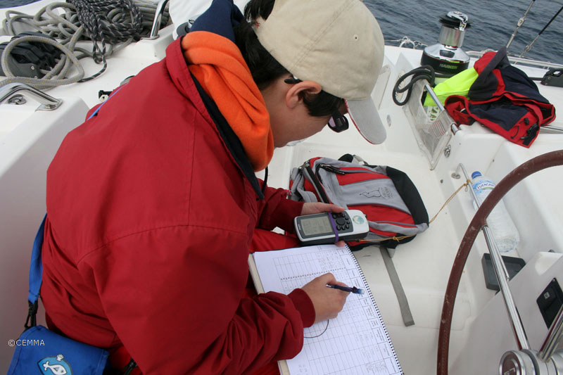 The methodology used during the campaign was that established during previous meetings of the cetacean study groups who are working on this project. Groups of two people were established in order to carry out the observation, placing one on the right-hand side and another on the left-hand side of the boat, and a third person for collecting data every 20 minutes on the meteorological conditions, position, depth and course. The observation was carried out within a 90º field of vision from the right-hand side of the boat and 90º from the left-hand side of the boat. At the same time, several people were in charge of taking photos of the cetaceans for photo-ID and behavior, and another person made recordings in order to study the behavior.