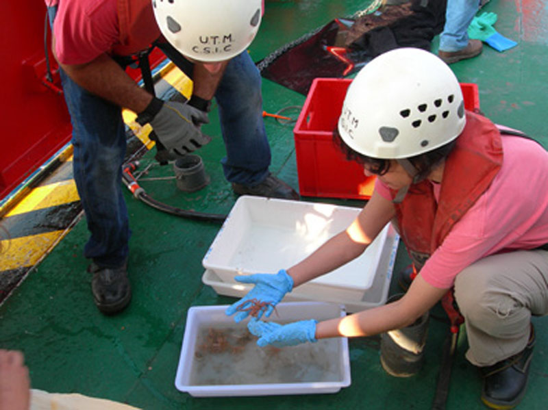 Just after breakfast at 8 in the morning we start explorations with the ROV, and at the end of the day we were able to finish 4 transects. We are doing very well. The image quality is excellent, and they have allowed us to observe the platforms bottom communities near the canyon. We have found the crinoids shoals we were looking for. By midnight we are satisfied with what we had achieved today, taking advantage of the weather bonanza, and the ever excellent and efficient crew of the Garcia del Cid boat. We have also taken 6 bottom draggings and a bag of samples that will keep us busy for some weeks in the lab.