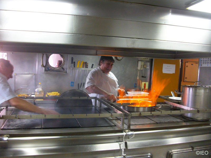 A las cinco en punto, Quique trae el material que se necesita en cocina para el día, que está distribuido por el barco en diferentes despensas, habitáculos y frigoríficos, lo que significa que está de arriba a abajo cargando bultos un buen rato. Es el ayudante para todo en la cocina, así que va preparando los alimentos a medida que el Maestro los va necesitando, pela y corta patatas y otras verduras, etc. A las 7 llega Antonio, el segundo cocinero, que también adelanta trabajo y ayuda a cortar verduras y otros alimentos. En cocina preparan todos los días tres platos para comer y tres para cenar, para más de 40 personas. A las 8 llega Antonio, el primer cocinero, que planea y decide como va resolver los servicios que va a cocinar. Esta tarea es más complicada de lo que parece, hay que tener en cuanta las dietas especiales de algunos comensales, las alergias, los regímenes, las intolerancias y a la vez, mantener una dieta equilibrada. Ya no hay muchos barcos en los que se mantengan tres platos en cada comida, con carne, pescado, verduras, fruta, yogures. Antonio administra la comida, prepara los menús que supervisa el Capitán, como todo a bordo. Además, como es un magnífico profesional de cocina, enamorado de su trabajo, se ha convertido en un verdadero científico culinario pues se preocupa de investigar nuevos platos, diferentes formas de hacer una comida e idear formas diferentes de cocinar la variedad limitada de alimentos que tiene a su disposición, para conseguir una dieta equilibrada. Como os podréis imaginar, todos agradecemos a bordo la labor que realizan en las cocinas y en la camareta. Somos conscientes, tal y como dejó escrito Napoleón, que un ejército camina sobre sus estómagos, pero también valoramos la máxima de Grimod de La Reynière relativa a la buena mesa y al mejor comensal al goloso le gusta comer bien, cocinar buena comida y seleccionarla mejor. Todo esto figura en la mente de los responsables de la cocina del barco y los científicos saben de su buen hacer.