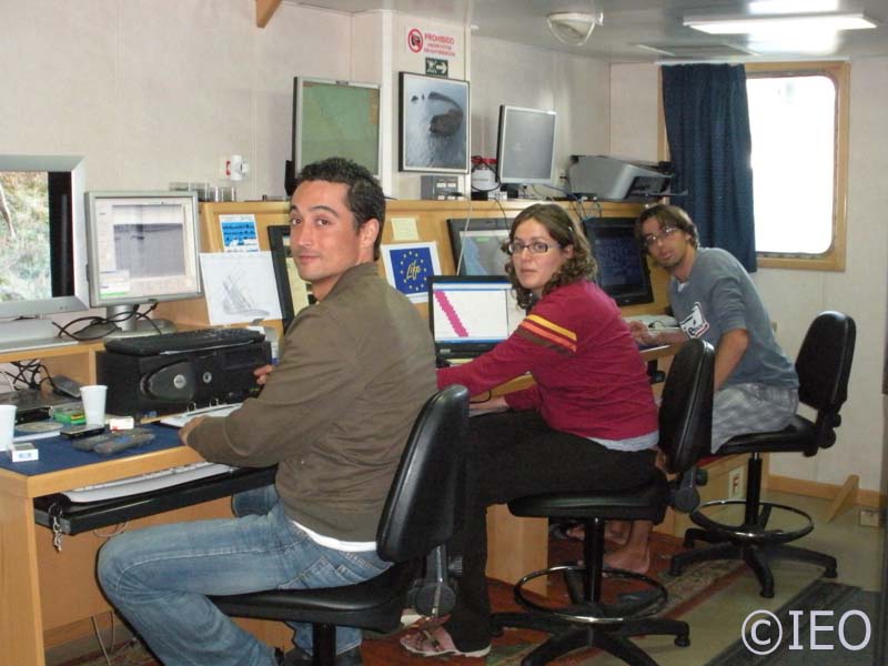 Curro, Desi y Antonio se apresuran para situarse en sus puestos de trabajo, topas, navegación y multihaz, y enseguida comenzamos a levantar los perfiles sísmicos y batimétricos que se correspondan con las líneas que ha de correr el puente. Todos coordinados que para eso está de Campaña. El tiempo parece que nos va a acompañar durante todo el día, así que es previsible que las sondas nos proporcionen buenos registros y datos científicos de relevancia. El pronóstico de es variable fuerza 3, tendiendo posteriormente a componente oeste con mar rizada a marejadilla. Vemos en nuestra estación que el viento es de dirección 53.8º y la velocidad a esta hora de la mañana es de 3.4 m/s con ráfagas de 3.7 m/s. La humedad relativa es de 83.3% y la temperatura del aire 19.3º C, con radiación solar de 427.5 W/m2. No nos podemos quejar. No pasaremos calor.