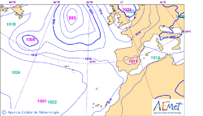 Las previsiones de la Agencia Española de Meteorología también hablan de buen tiempo (ver la imagen satélite un poco más abajo), y nos da algunos detalles que ilustran lo que estamos describiendo desde hace unos días: viento suroeste fuerza 3, arreciendo a 4 por la tarde, intervalos de visibilidad regular o mala por brumas y nieblas, marejadilla. El anticiclón parece que no nos abandona y tendremos buena mar, al menos, durante los próximos siete días. Confiemos que no cambien las condiciones por bien de la calidad de los datos que estamos tomando.