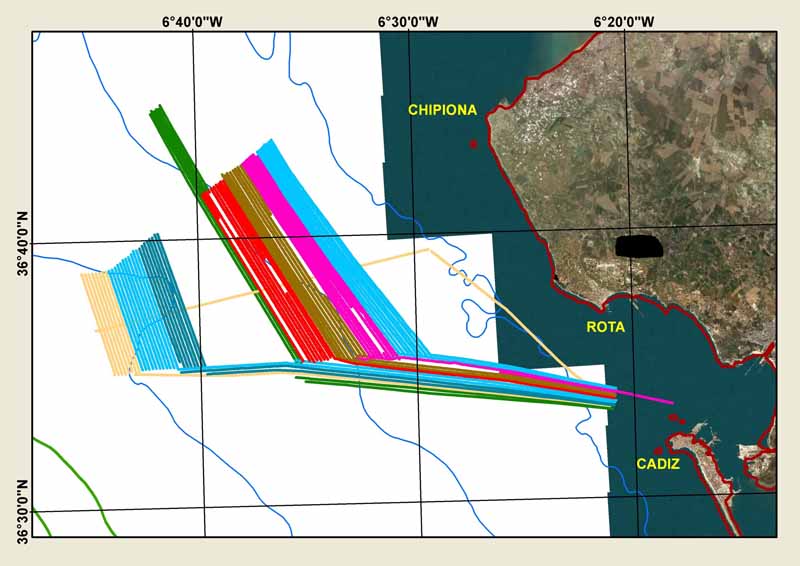 Navegamos a toda máquina hacia el punto de inicio de los perfiles, analizando los datos que hemos recogido hasta hoy, para así ir fijando los puntos de muestreo biológico y sedimentario. Dejamos a babor la arboleda de la Alameda Apodaca y el amurallado Castillo de la Candelaria, construido en la época de Carlos III, y nos dejamos mecer por el viento de poniente que ya se deja notar. Llegados al punto de inicio de los perfiles, 36º 34.71´N/6º 35.82´W, y a una profundidad de 63.2 metros, volvemos a bautizar el Perfilador de Velocidad: Tª en superficie, 21.15º C; Tª en profundidad, 15.1º C. Esto quiere decir que tendremos que aplicar la corrección de propagación de la velocidad de sonido a 1509.6 m/s en superficie y 1526.56 m/s en profundidad. Ahí vamos. Nos disponemos a correr la primera línea.