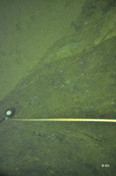Fotografía submarina obtenida por el VOR en la falda del volcán de fango Albolote en el que se observa una peligrosa red de arrastre de un arte de pesca abandonado en el fondo del mar © IEO