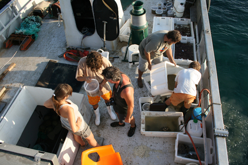 Para terminar el día, lanzamos el bou de vara en una pendiente supuestamente arenosa, pero se queda algo enganchada en una piedra. A pesar de ello vuelve a bordo con un magnifico ejemplar del coral Dendrophyllia, que filmamos con el ROV en la primera parte. Lo colocamos en un contenedor con mucha agua de mar, para ver si Pablo, nuestro experto en antozoos, lo puede llevar vivo hasta la Universidad de Sevilla. Hay esponjas por todas partes y Cèlia, la especialista en estos animales, no da abasto.