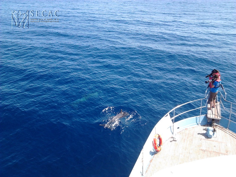 Todo está listo y acondicionado para zarpar. Abandonamos el muelle de Puerto Calero a las 9:30 h. Aparte del equipo habitual, hoy nos acompañan Jorge Cáceres, Clara Suárez, Violeta Sánchez, Francisco González y David Luna. Igual que ayer, el día ha estado muy bueno y las condiciones para avistar cetáceos han sido inmejorables. Poco viento, escaso mar de fondo, cielo despejado… la detectabilidad ha sido excelente durante todo el día, de nuevo algo poco habitual en esta zona.