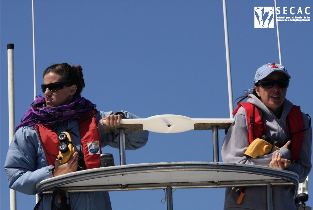 El mar de fondo, también del NE, no ha superado 1 m de altura pero las pequeñas crestas de las olas han hecho que la detectabilidad sea pobre (valor 1) la mayor parte de la travesía. El día ha estado muy despejado (nubosidad <20%) y sin rastro de la calima de las últimas semanas. Aunque las condiciones no han sido del todo malas, los transectos que se han realizado (elegidos aleatoriamente según la metodología del programa Distance Sampling) han resultado quedar totalmente atravesados a la ola y durante todo el día el Oso Ondo se ha mecido de una banda a otra, que aunque suavemente, no deja de ser un movimiento bastante incómodo después de unas cuantas horas. Aun así, la buena temperatura, el sol, el buen humor de los nuevos voluntarios y dos grupos de delfines en la proa, han hecho de la salida un día de trabajo agradable.