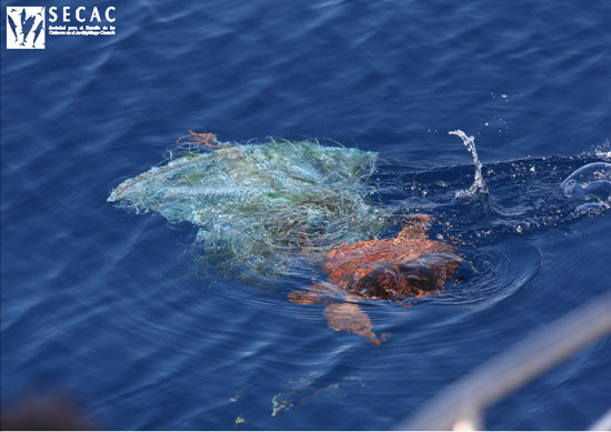 Igual que en días anteriores, durante unas horas y en una zona al noreste de Lanzarote se vieron un total de 44 tortugas bobas (Caretta caretta). Una de ellas estaba enredada en un amasijo de redes y cabos, con varias vueltas alrededor de una de las aletas delanteras. Se pudo subir a bordo y se liberó de la red antes de devolverla al mar. También se sacó del mar un palangre ilegal que flotaba a la deriva, con varios cientos de metros de cabo de pesca enredados, por suerte era reciente y no había animales atrapados en él.