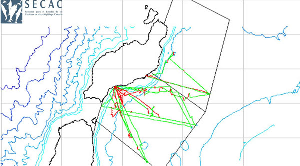 Donde sí se anotaron todos los grupos de edad, neonatos inclusive, fue durante el contacto con varios grupos de delfines moteados (Stenella frontalis), que, como siempre, se sintieron atraídos hacia el barco, sobre todo a la ola que desplaza la proa y al cable del hidrófono, donde estuvieron emitiendo silbidos y clicks durante gran parte del avistamiento. A destacar en esta primera semana también fueron dos avistamientos de zifios de Cuvier (Ziphius cavirostris) y uno de cachalote enano (Kogia sima). En el caso de los zifios, hubo un avistamiento de 4 individuos, mínimo dos machos maduros, que llamó la atención de los investigadores por lo inusual de ver a los zifios inmóviles en superficie ¿descansando quizá? Después de inmersiones relativamente cortas (no más de 15 minutos). Se realizaron diez esperas y después de todas ellas los individuos fueron reavistados y fotografiados. El cachalote enano sin embargo, apenas si pudo ser fotoidentificado desde lejos ya que nada más detectar la presencia de la embarcación se hundió y no volvió a ser visto.