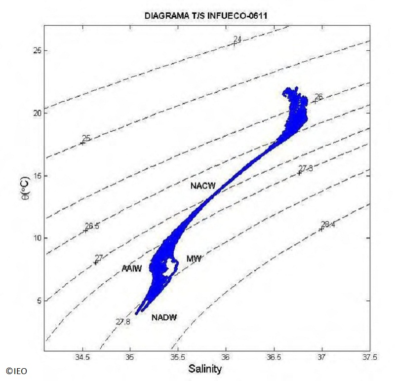 También se han llevado a cabo 30 estaciones de CTD dispuestas en cuatro radiales (dos paralelas al ecuador, por el norte y el sur del banco, dos oblicuas en dirección NE y SE, cruzando el banco) de manera que con el esfuerzo que se puede realizar en número de días, se cubra el posible flujo entrante y saliente de corriente, y la variabilidad batimétrica de la zona.