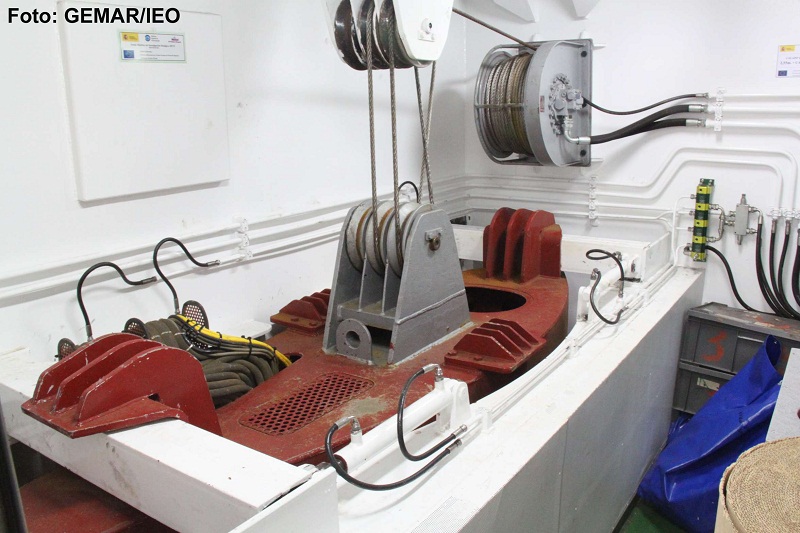 Sala de la barquilla que contiene la sonda multihaz. Este sistema de prospección permanece replegado mientras no hay prospección. Consiste en un sistema telescópico, por lo tanto, cuando se inicia la prospección nocturna, se acciona el mecanismo que permi