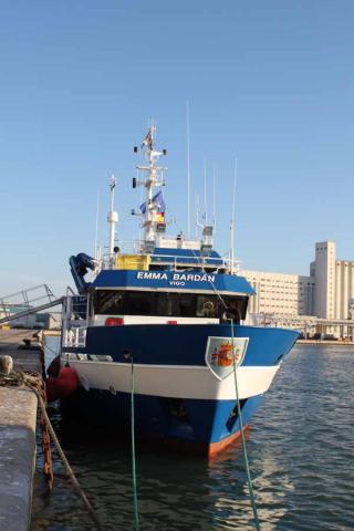 El B/O Emma Bardán atracado en el puerto de la Zona Franca, donde es prácticamente imposible que nos visite alguien más que las gaviotas ©IEO