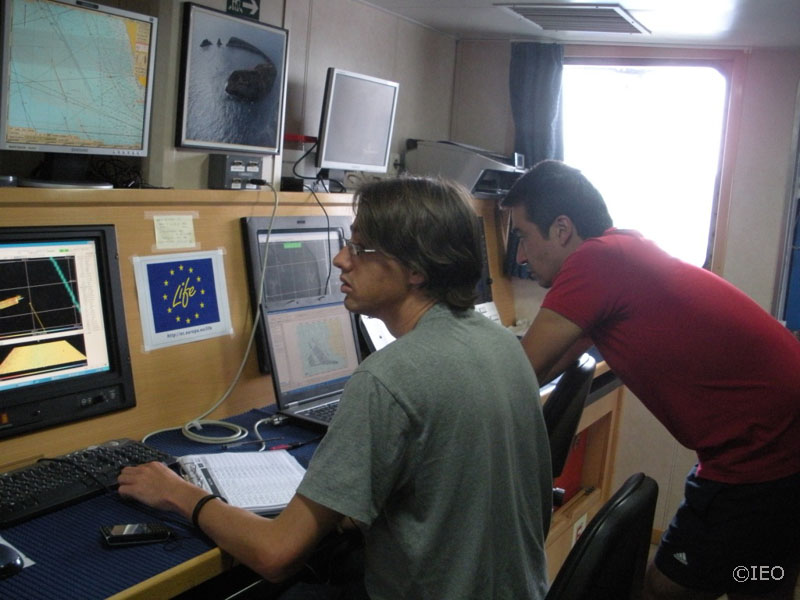 Mañana domingo, continuaremos con los barridos de sísmica e intentaremos cubrir la zona de los paleocanales más profundos que hay frente a la desembocadura del río Guadalquivir. de Campaña tendrá que tomar alguna decisión arriesgada, escuchando el parecer de todos los que la acompañamos en esta aventura "En busca del hábitat 1180", pues la limitación en el uso de la multihaz va a ser un escollo difícil de superar. Ella está tranquila en el despacho al aire libre que se ha buscado encima de la techumbre del puente. Allí está por encima del bien y del mal, y la brisa marinera le ayuda a tomar decisiones, reposando sobre un aparejo que hace las veces de sofá ergonómico.