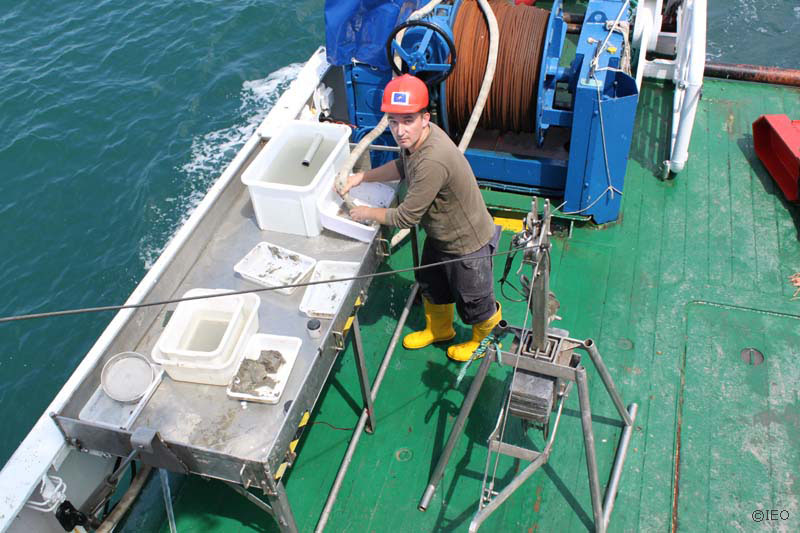 El Dr. Rueda a popa, delante de su mesa de procesado de sedimentos, rodeado de bandejas con las fracciones de material dispuestas para su tamizado en húmedo ©IEO