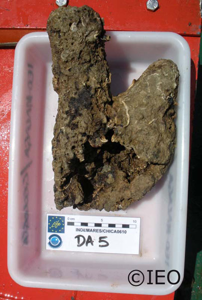 Seguimos hacia Gazúl y arrastramos con draga. En el puente el Capitán y el Primer Oficial discuten las anotaciones en el Libro de Bitácora, a consecuencia de los cambios en las estaciones que habíamos prefijado. En esta primera draga sacamos las chimeneas que ya hemos mencionado y que tanta alegría nos han dado, y extraemos numerosa fauna englobada en una matriz de arena fangosa muy bioclástica: Munida, Medaeus, Iporomya, Eucinidae, Gorgonias flexibles, Astarte sulcata, Flabellum, Caryophillia, Cidaris, Esponjas, etc. Hay fragmentos de enlosados y costras.