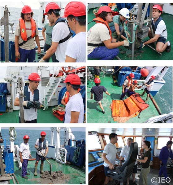 He buscado algunas fotografías, y os aseguro que tengo varias decenas más haciendo otras tantas tareas, en las que siempre está supervisando e implicado hasta las cachas en lo que haya que hacer. Mirarlo con la pala en la mano para recoger el fango de los muestreos, largando la box corer, comprobando que todos los mecanismos de sujeción de las dragas funcionan correctamente, ilustrando a unos y otros -y siempre a preguntas de los demás, nunca lo hace por el hecho de impartir magisterio-. Lo tenéis, como os decía al principio, junto al noray para soltar amarras, o en el puente realizando sus funciones de Primer Oficial. Una auténtica máquina a la que nada se le escapa. Pero si algo destacable tiene, además de sus inmensas capacidades profesionales, es su afabilidad, su facilidad para conectar con la gente, su capacidad para polemizar cuando es necesario, sus sólidas argumentaciones en las polémicas y su simpatía con todos los demás, aspecto que hemos sentido particularmente los científicos que hemos convivido con él a bordo. Forma parte de la hinchada que apoya a la Selección española con la misma pasión con la que maniobra con los sistemas de muestreo, o con la que corta el jamón que ha traído Nieves. Un hombre cabal y un completo profesional del que todos hemos aprendido mucho. Por ello queremos darte las gracias desde este diario de campaña, por todo lo que has hecho y por lo que nos has enseñado. Ha sido un lujo poder compartir tantas horas de trabajo a bordo contigo. El B/O Emma Bardán está bien atendido con personas como tú, Manu.