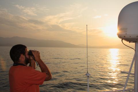 Durante los periodos de navegación diurnos, se realizaron censos de aves marinas mediante transectos, siguiendo la metodología estandarizada por Tasker et al. (1984) y adaptada por SEO/BirdLife (2007) a la zona de estudio. Este tipo de censo consiste en contabilizar las aves observadas en una franja imaginaria (generalmente 300 m) a uno o dos lados del barco (en función de las condiciones de observación), a medida que éste avanza a una velocidad (preferiblemente 5-15 nudos) y dirección constante. Para las aves en vuelo se aplica una corrección basada en conteos instantáneos o snapshots. Las observaciones “fuera de transecto” se registran de forma complementaria, y se utilizan en el cálculo de abundancias relativas (aves/km.), aunque no para la estima de densidades. Durante la realización de los censos por transectos también se registraron las observaciones de cetáceos. Aprovechando la realización de pescas de arrastre, también se realizaron censos a popa para contabilizar las aves atraídas al barco durante las maniobras de virada del arte.