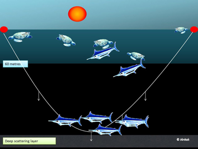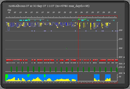 La pesca más profunda reduce en gran medida la captura accidental de tortugas. En éste mapa de seguimiento por satélite se pueden analizar los patrones de inmersión de las tortugas cuando se encuentran en el caladero de pesca de palangre. En Alborán las tortugas pasan más del 90% del tiempo en superficie. Estos datos, transmitidos a los pescadores a través de programas de capacitación y experimentos pesqueros ha hecho que gran parte de la flota de palangre pesque ya a más de 100 metros, donde los anzuelos quedan fuera del alcance de las tortugas